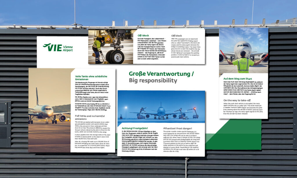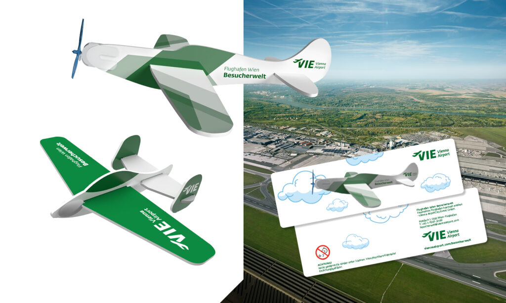 Für den Flughafen Wien setzten wir verschiedene Branding- und Gestaltungsmaßnahmen um. Dazu gehörte das Branding von Give-aways in Form von Styropor-Flugzeugen, die Besucher:innen spielerisch an die Marke heranführen.