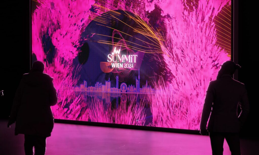 Visuelles Highlight war die großflächige LED-Installation in der Eingangshalle der Hofburg, die mit einer von uns beauftragten Animation bespielt wurde und bereits beim Eintreffen der Gäste für Aufmerksamkeit sorgte.
